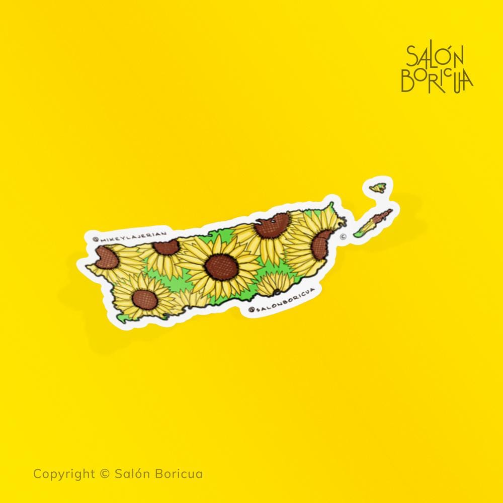 Un hermoso diseño que muestra el archipiélago de Puerto Rico con girasoles en su interior. Una representación del paisaje caribeño lleno de color y vida, donde la naturaleza y la belleza de la isla se unen en perfecta armonía.