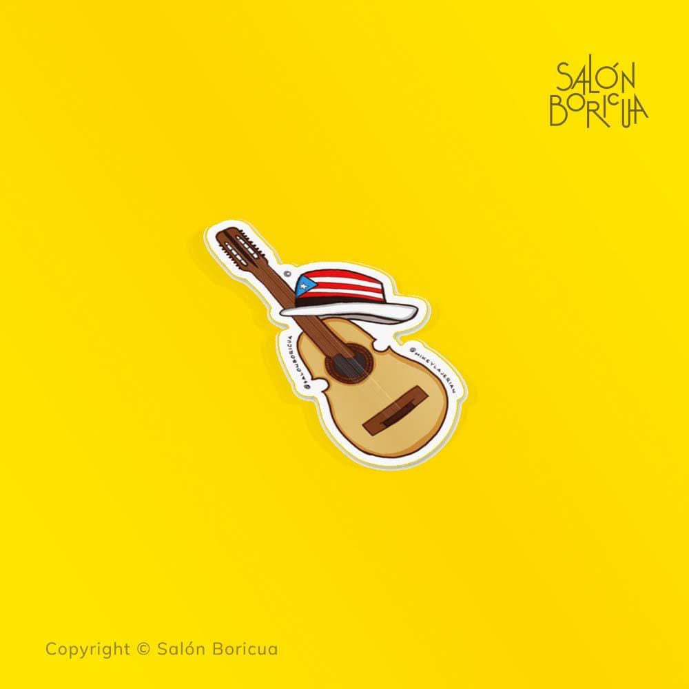Un cuatro puertorriqueño adornado con una bandera de Puerto Rico y un sombrero, representando la música y la cultura de la isla. El cuatro es un instrumento musical icónico en Puerto Rico, y la bandera y el sombrero son símbolos de la identidad y el orgullo de la cultura puertorriqueña.