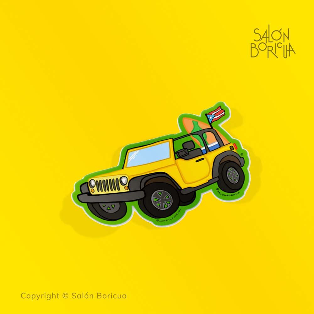 La jeepeta amarilla con la bandera de Puerto Rico y una tabla de surf es el vehículo perfecto para los aventureros que quieren disfrutar de las playas de Puerto Rico. Con amplia capacidad de carga, esta jeepeta playera te llevará a donde quieras.